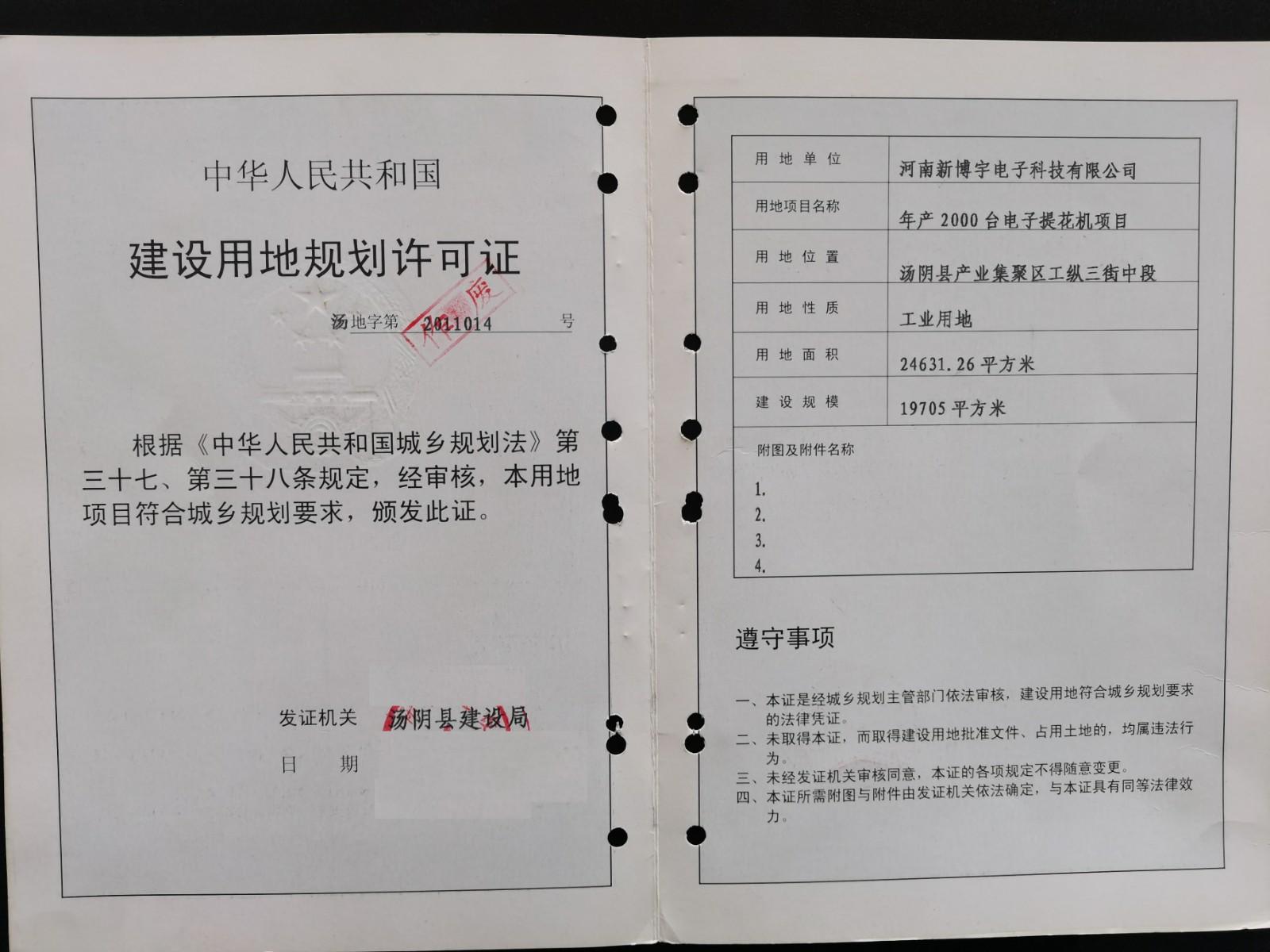 河南新博宇电子科技有限公司于2011年3月15日办理《建设用地规划许可证》汤地字第2011014号,项目名称为年产2000台电子提花机项目。