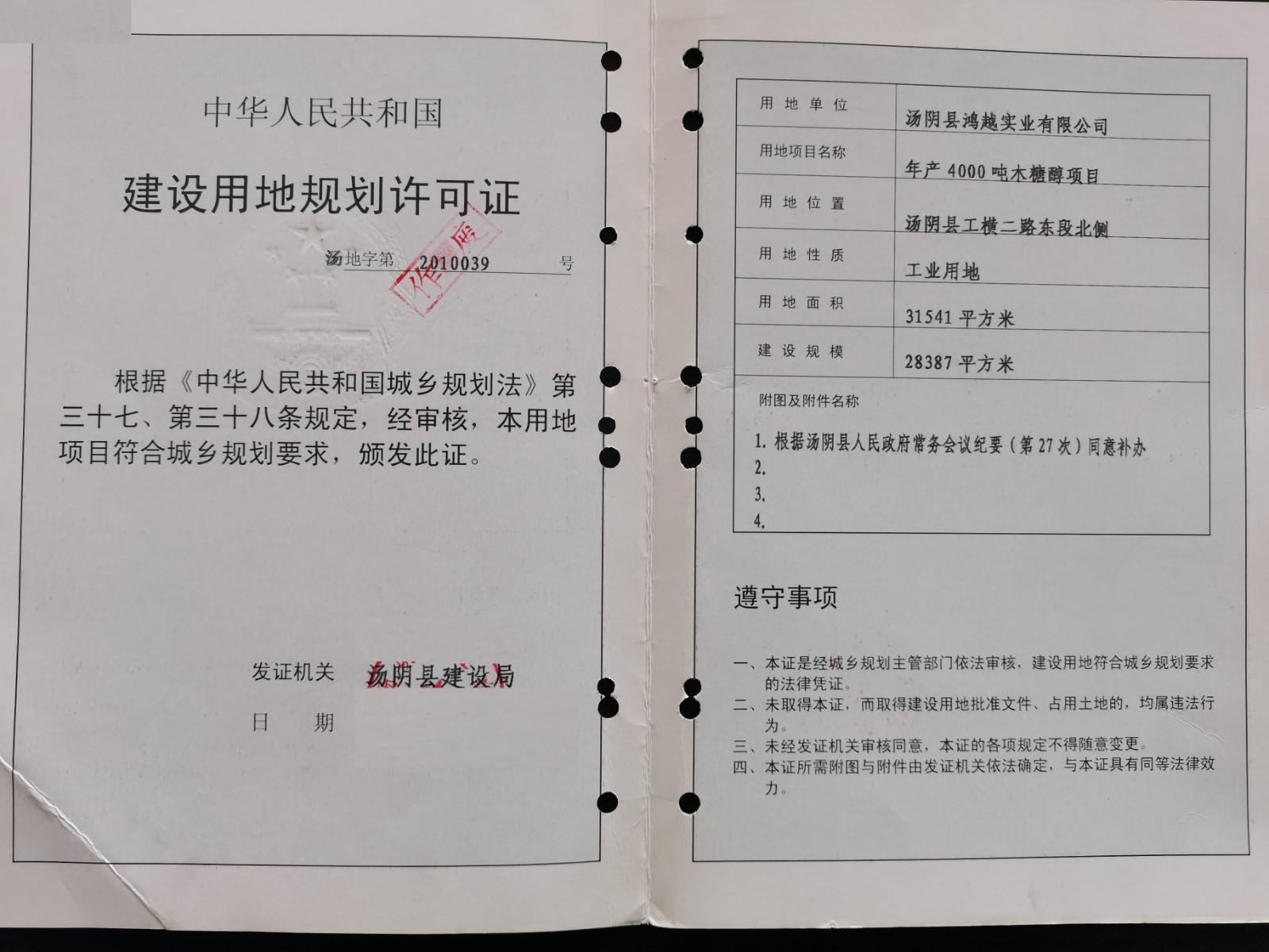 汤阴县鸿越实业有限公司于2010年12月27日办理《建设用地规划许可证》汤地字第2010039号,项目名称为年产4000吨木糖醇项目。