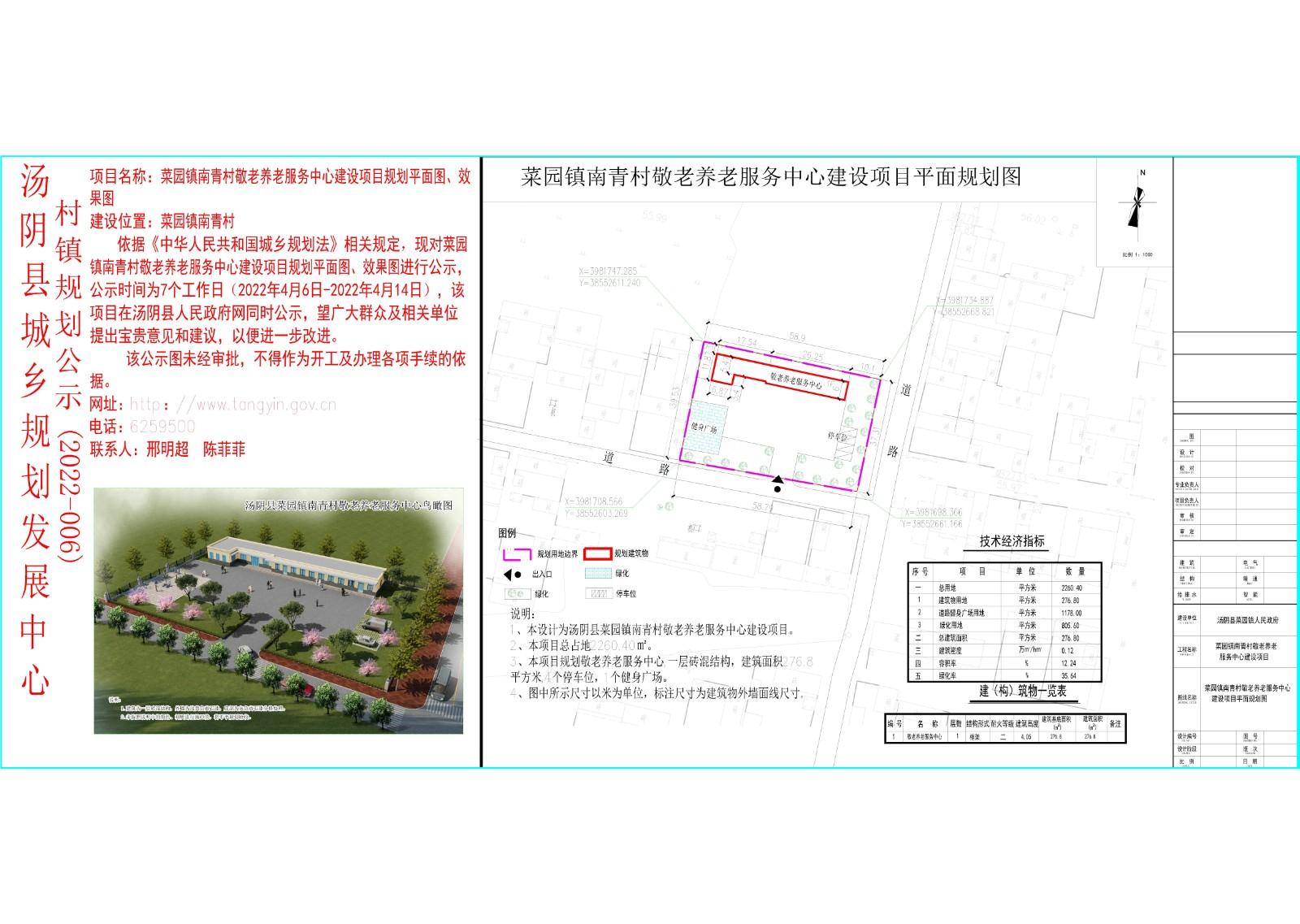 汤阴县城乡规划发展中心村镇规划公示(2022-006)菜园镇南青村敬老养老服务中心建设项目规划平面图、效果图
