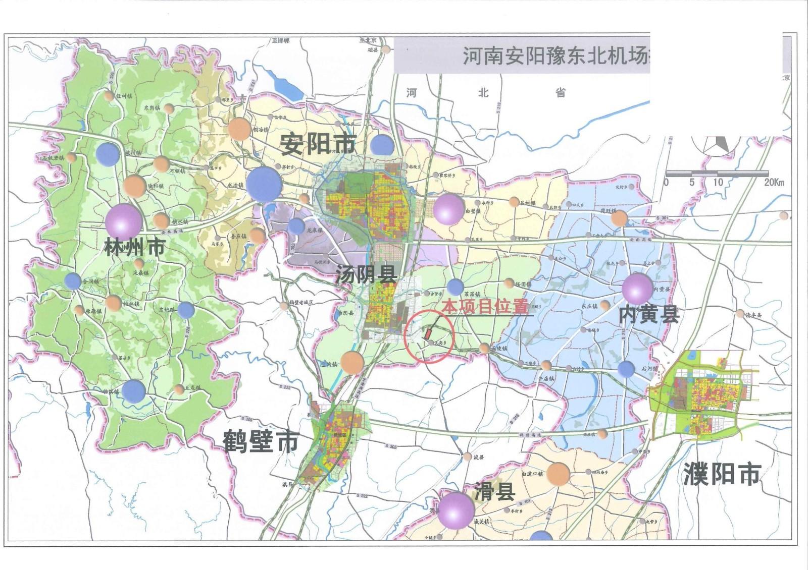 三、该项目已纳入《汤阴县城乡总体规划(2013-2030),选址位于汤阴县伏道镇和瓦岗乡域内,按4C级标准新建民用机场, 主要包括飞行区、航站区、货运区和其他设施。