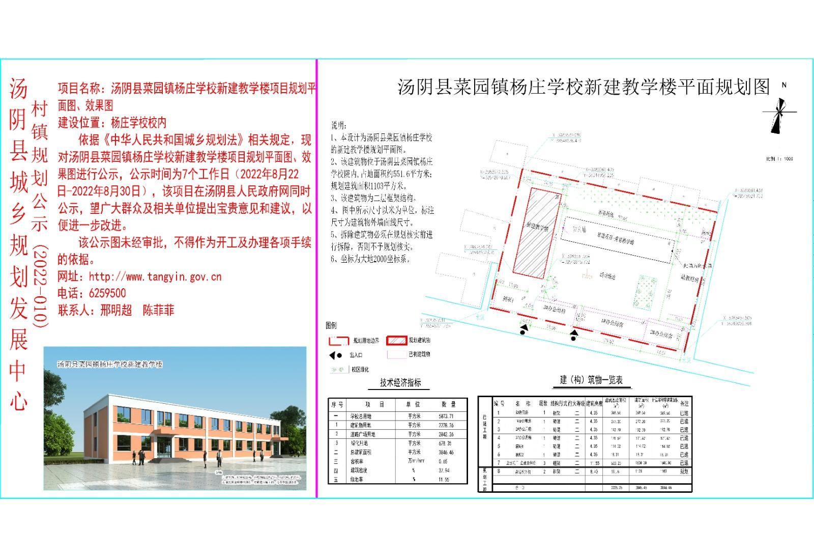 汤阴县城乡规划发展中心村镇规划公示(2022-010)汤阴县菜园镇杨庄学校新建教学楼项目规划平面图、效果图