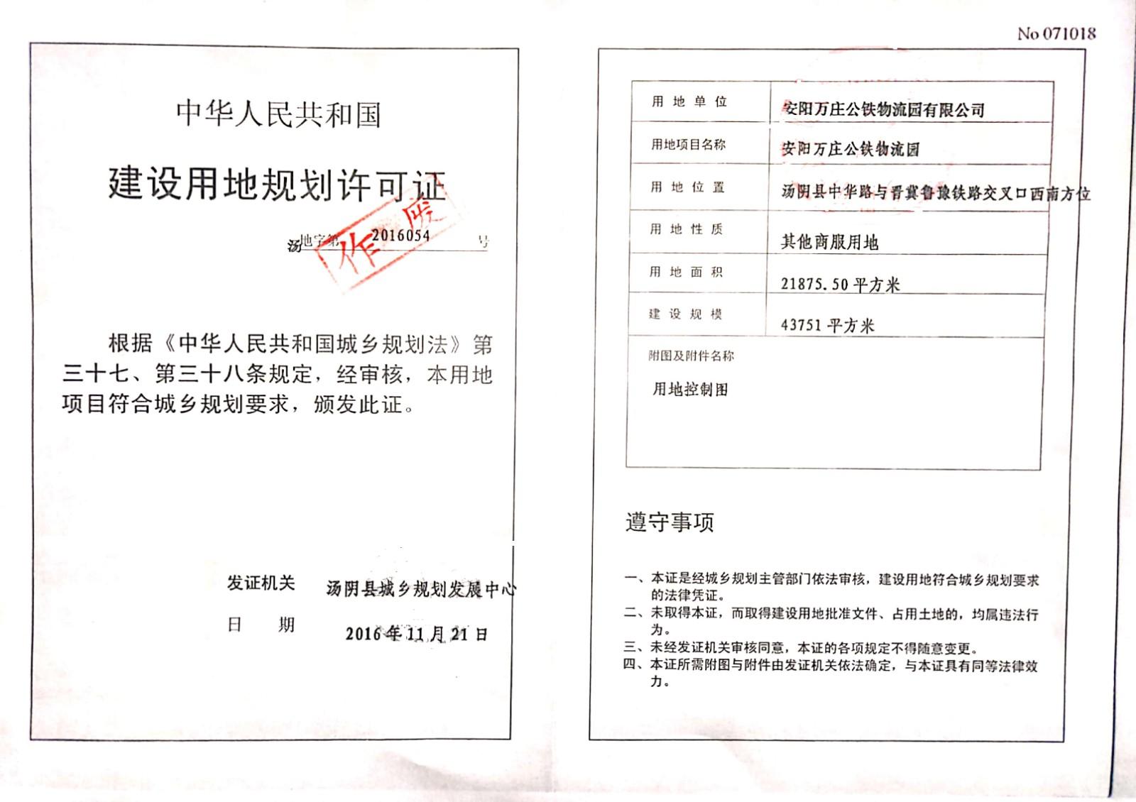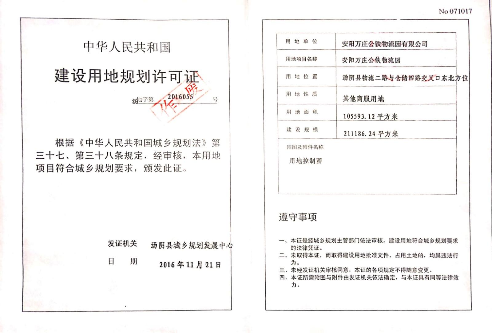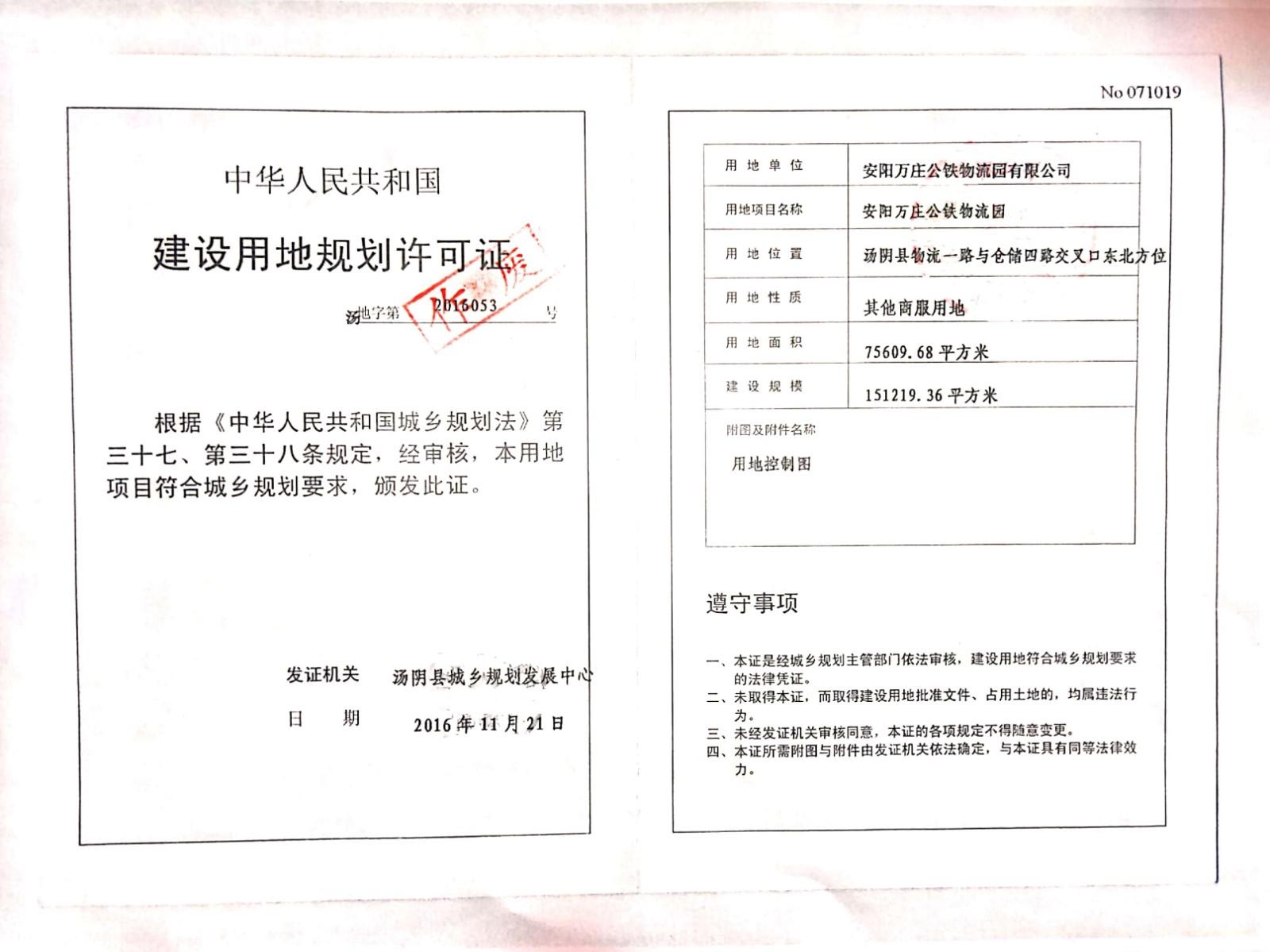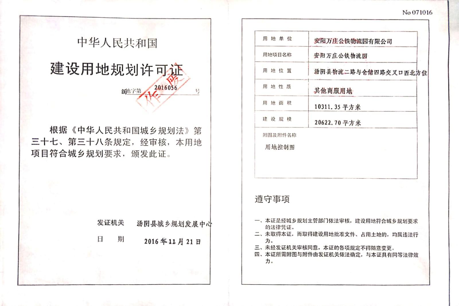 安阳万庄公铁物流园有限公司于2016年11月21日办理《建设用地规划许可证》汤地字第2020070号、汤地字第2020071号汤地字第2016053号、汤地字第2016054号、汤地字第2016055号、汤地字第2016056号,项目名称为:安阳万庄公铁物流园。