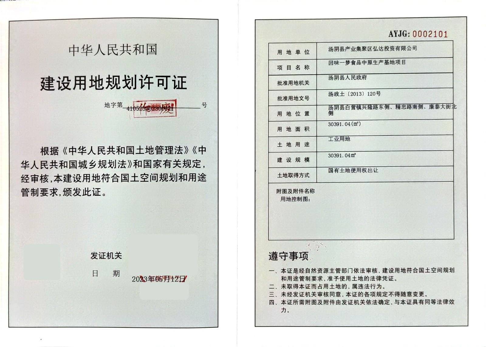 汤阴县产业集聚区弘达投资有限公司于2023年5月12日办理《建设用地规划许可证》地字第410523202300021号,项目名称为:回味一梦食品中原生产基地项目。
