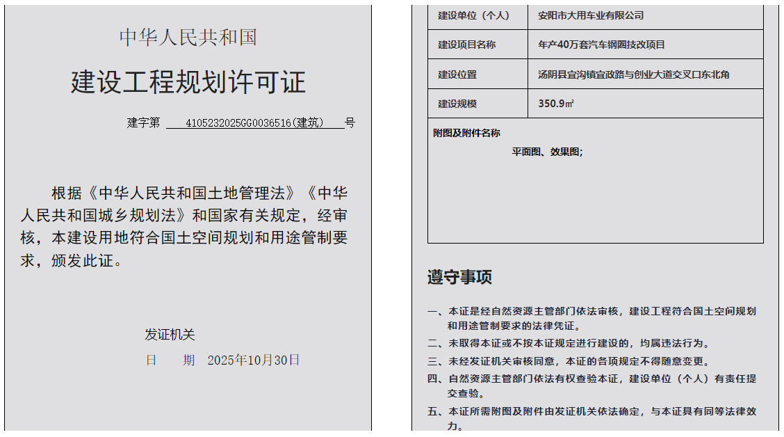 汤阴县城乡规划发展中心规划批后公告2025年4105232025GG0036516(建筑)号--年产40万套汽车钢圈技改项目