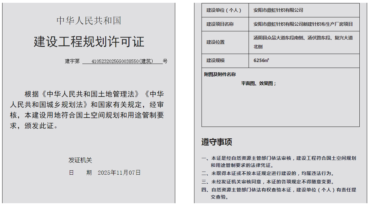 汤阴县城乡规划发展中心规划批后公告2025年4105232025GG0038550(建筑)号--安阳市鼎虹针织有限公司新建针织布生产厂房项目