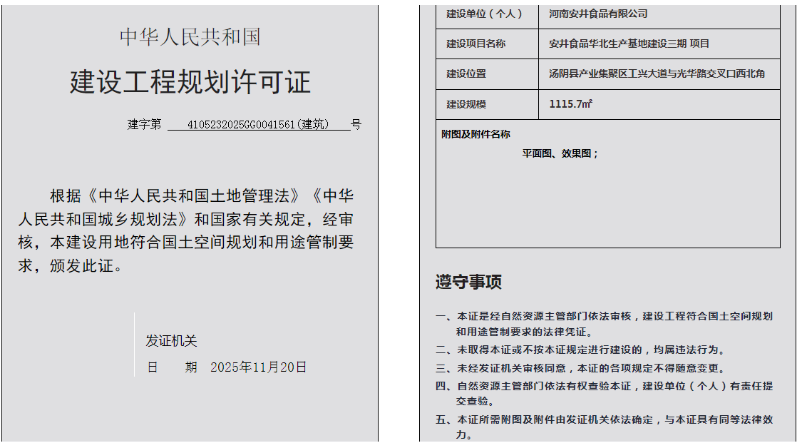 汤阴县城乡规划发展中心规划批后公告2025年4105232025GG0041561(建筑)号--安井食品华北生产基地建设三期项目