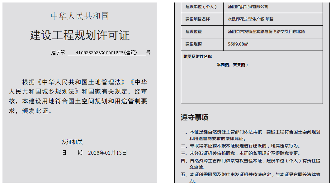 汤阴县城乡规划发展中心规划批后公告2026年4105232026GG0001629(建筑)号--水洗印花定型生产线项目一元小婵