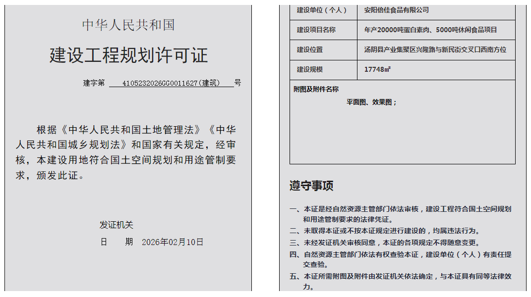 汤阴县城乡规划发展中心规划批后公告2026年4105232026GG0011627(建筑)号--年产20000吨蛋白素肉、5000吨休闲食品项目